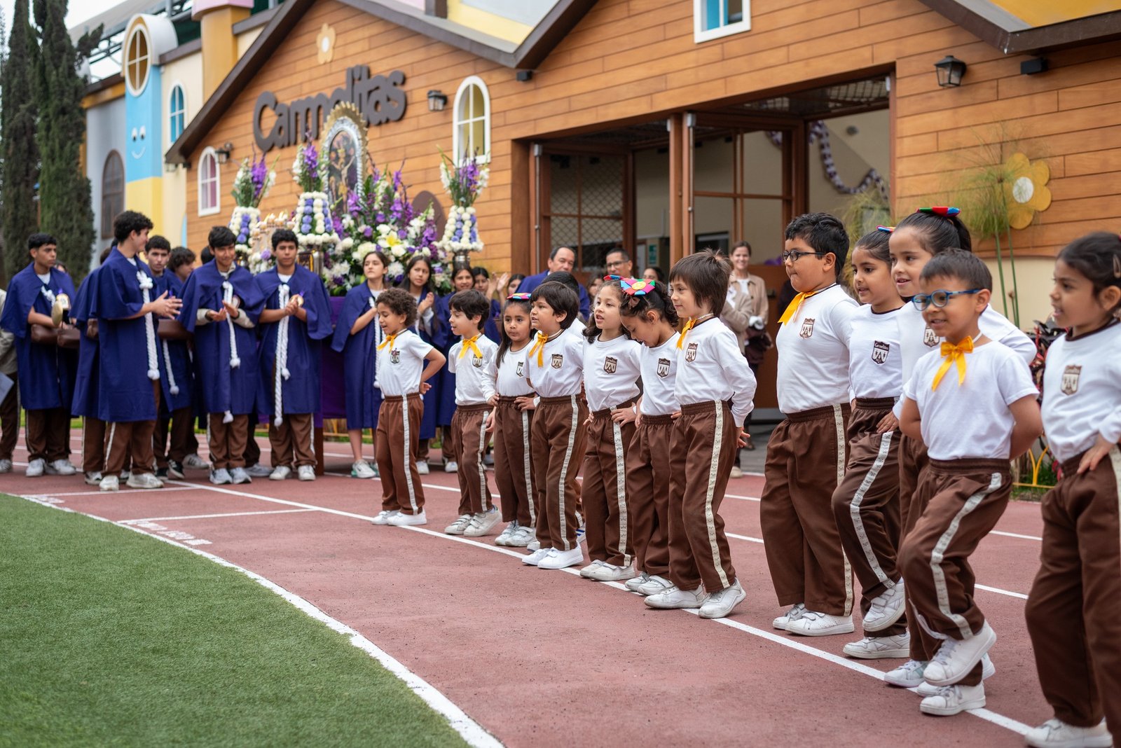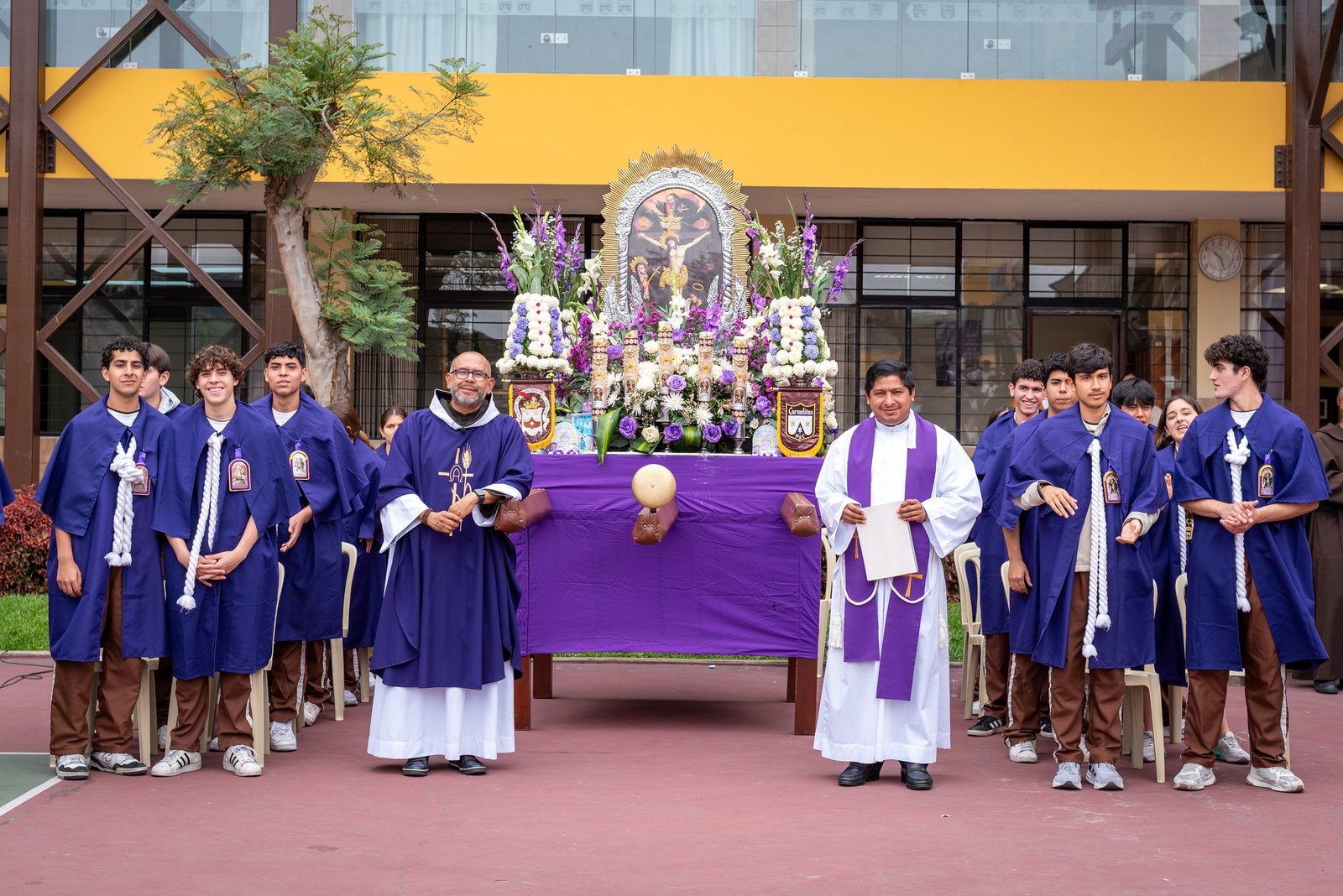 Cabe resaltar que las distintas cuadrillas encargadas de cargar el anda estuvieron integradas por estudiantes carmelitas, padres de familia, docentes, así como personal administrativo y de mantenimiento, quienes asumieron este acto con gran respeto y compromiso espiritual, acompañando el recorrido con oración y recogimiento.